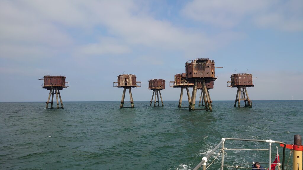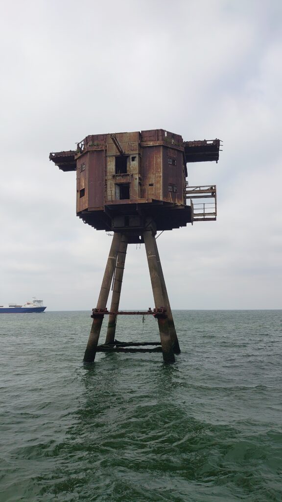 My friend Kevin treated me to a trip out into the seaward end of the Thames estuary to see the WW2 forts. To get there, we traveled down to Kent, then crossed the bridge to the Isle of Sheppey, which is reminiscent of Orwell Bridge on our home turf. Once on Sheppey we soon found Queensferry dock and parked up. There were lots of screaming kids and their parents at the jetty. Surely, we aren’t going to be seven hours at sea with those little horrors? But luckily enough they are just waiting for the Jet Ferry to Southend, off for shopping or McDonalds or roller-skating or whatever you can do in Southend to please the kids on a Saturday morning. After all they’ve all gone our boat’s owner, Martin Hurley arrives and gives us a brief briefing and I’m sure that he said the captain was his husband, but Martin doesn’t accompany us on this voyage. The captain is old – Captain Alan is his name – and the first mate leans over to talk to us; he’s a chunk of a man, a London/Essex type, although later he claims to be from Devon.