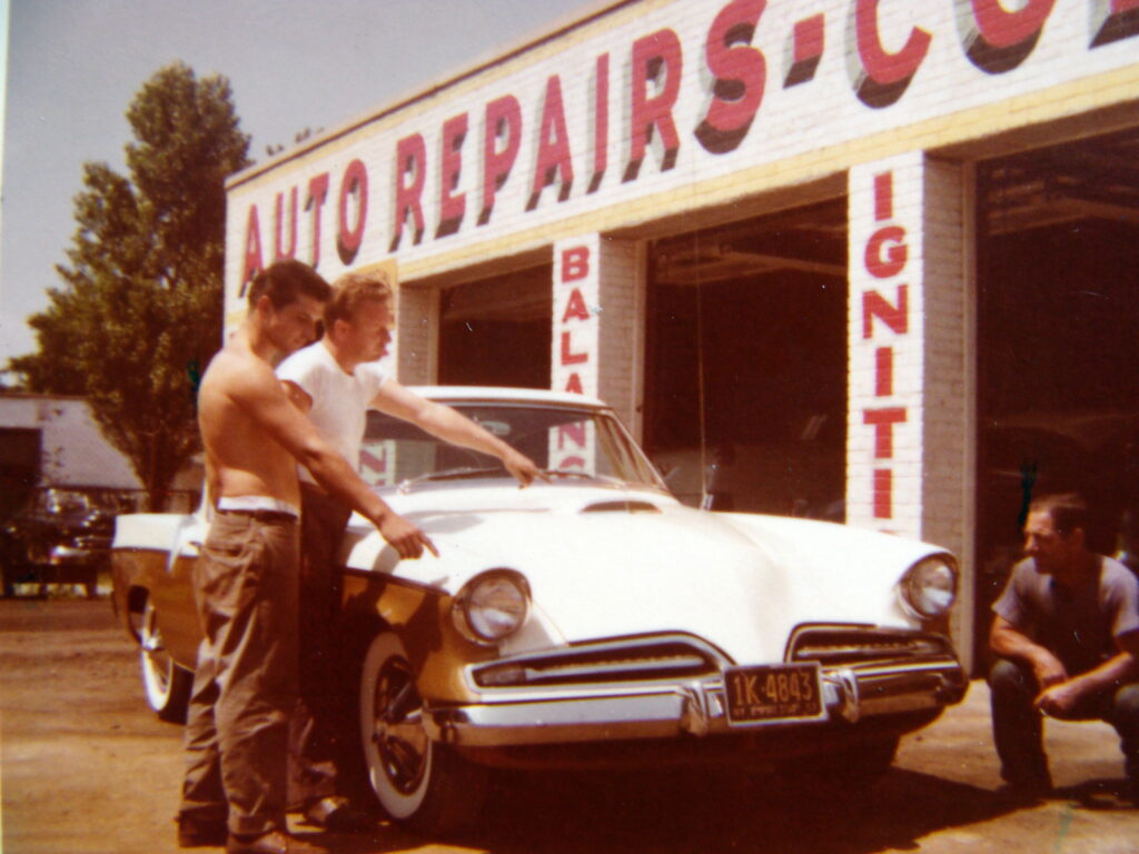 Geno’s father’s auto body shop, with a Raymond Loewy-designed Studebaker Hawk. [Geno Zandomenego]