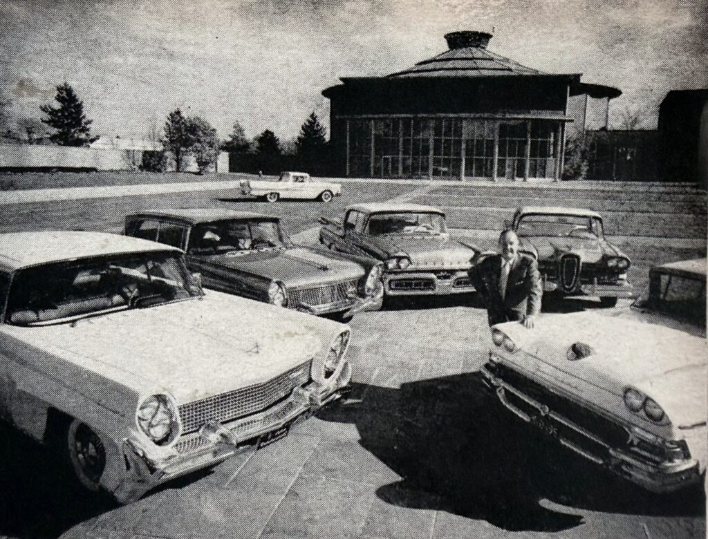 The Ford Shoebox line with executive George Walker. Note the Edsel behind Walker: a catastrophic design named for Henry Ford’s sone. [Ford Motor Co.]