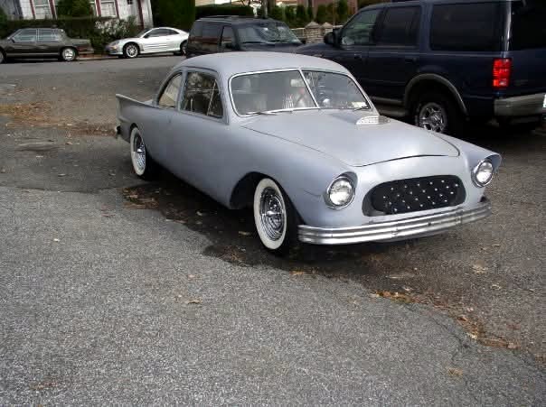 “The guy who did the car was a serviceman… He took the car to Japan and sectioned it in Japan. He did all the welding with coat hangers as brazng rods… that’s how they did the welding in those days. And the body work was done with lead… This was before Bondo. When I sanded it down, I had to see what was going on… what color I was going to paint it. When I saw the work, all the welds, where the lead was… I left it like that and I brought it to a couple of shows and people went wild. They saw it and were like Wow! So I said, you know what… I am leaving it like this. And I clear coated it. It shows all the welding, where the cuts were made to shorten it down and everything. The fins were hand-made.  The fins look actually came after this car was manufactured. It has ’55 Chevy headlights and rims, it has a T-Bird hood scoop, the grill… I could never figure out what he did with the grill. He pancaked the hood, he flattened the hood, he welded the whole front down, he put 1949 Plymouth bumpers on the front and back, hand-made fins, and he put 1950 Buick tail lights.