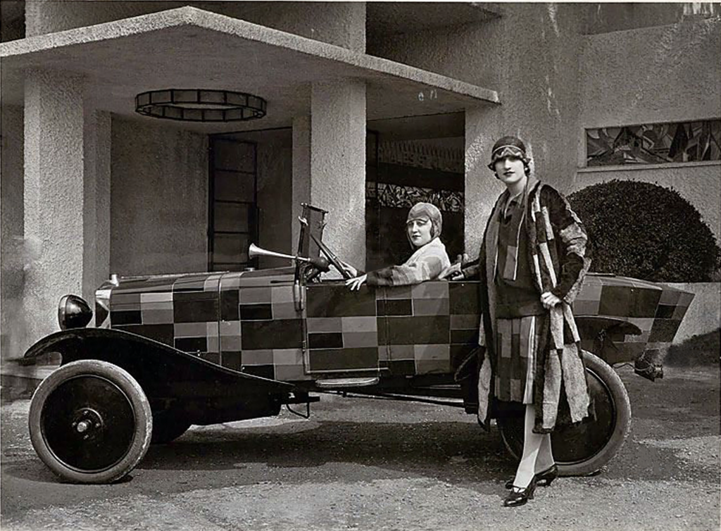 Maison Sonia boomed as a frenetic postwar spirit spilled over into modern art, design and decoration. In 1924/5, journalist Maurice Kaplan begged her friend Sonia Delaunay to apply one of her abstract designs to Kaplan’s charming new runabout, an Ariés 5-8hp Torpedo 3-seat boat-tail convertible. Sonia provided a pattern of rectangular color blocks in green, gray and black, in the mode of her copyrighted Simultané fabrics. Sonia was at this time financial partners with Jacques Heim, who invested 500,000 francs to establish Ateliers Simultanés – a nod to the Delaunays’ art theory – as a storefront studio, with Sonia-designed fabrics, knitwear, furs, handbags, scarves, and shoes, all of which were a runaway success. Her bold abstract patterns were particularly suited to the fashions of the 1920s, as their lack of waistline and minimal tailoring were suitable for any body size or shape, a concept familiar today to fans of Comme des Garçons or Marni. Sonia even produced special clothing for automobilists and their passengers, and surviving examples include a set of four embroidered cloche hats for the daughters of her friends Jean and Annette Coutrot.