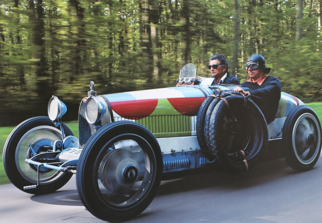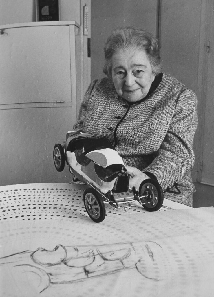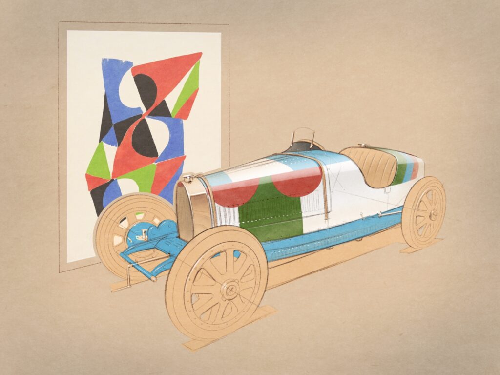 In 1973, Sonia – nearly 90 – was again invited to create a color scheme for a car, in this case a Bugatti T35, supplied to her as a 1:8 scale model by Jean-Paul Fontenelle. The model would be sold at auction to benefit the Bal des petits lits blancs, a children’s hospital charity, and had been organized by Artcurial and Hervé Poulain. The Bugatti T35 was an inspired choice as the perfect 1920s canvas for Sonia’s artwork, and her concept was arguably the best of her three Art Cars, with its colors arranged in bold, colorful roundels against blocks of color in blue, white, red, and green, very much in line with her graphic work over the previous 20 years. The model would have remained just that, a mock-up, had not the imaginative owner of an actual Bugatti T35, Marc Nicolosi, been inspired to make it real. Nicolosi asked his friend Hervé Poulain for permission from Sonia Delaunay to use the color scheme on his car. Her consent is preserved by the Nicolosi family in a letter of 3 October 1977: “I put one condition on this agreement, which is that the production be submitted to me before the words ‘after Sonia Delaunay’ are added.” Marc’s son Baptiste Nicolosi continues the tale: “Sadly, my father did not paint the Bugatti in the 1970s, and Sonia died soon after (1979). At the beginning of the 1990s he still wanted to do the paint scheme, so he contacted the owner of the model, asking ‘can you loan me the model so that I copy the paint scheme?’ He said yes, but we could keep the paint scheme ‘only for five years’. We pushed it a little bit, like 6 or seven years, but in the end my father put it back to gray.”