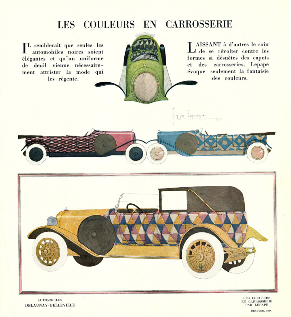 There was a contemporary context for Sonia’s Art Car in the aesthetic tumult of Art Deco Paris: the idea of an automobile painted with abstract patterns was already afoot. In 1923 the luxury automobile brand Delaunay-Belleville, est. 1904 by Louis Delaunay (whose unrelated surname sowed much confusion later), commissioned five well-known graphic artists to paint sample color schemes for cars, as an ‘essai sur les differentes manières de les carrosier’. The artists included Georges Lepape, Eduardo Garcia Benito, René Lelong, Jacques-Emile Ruhlmann, and Charles Martin. The resulting catalogue is exquisite and beautifully printed by Draeger in Paris (still in business). The proposed paint schemes are exuberantly Art Deco, and remarkably similar to each other, all using abstract geometric patterns in multiple colors. To my knowledge no customer ever actually ordered such a car, but even as an ‘ideal’ concept (so popular in the 20th Century motor magazines), such color applications were perhaps too flambouyant for the average wealthy automobilist.
