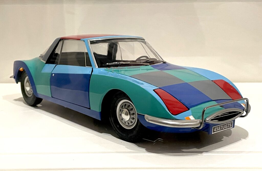 In an echo of the 1924 Delaunay-Belleville Art Car pamphlet, in early 1967 Sonia Delaunay was chosen for an exhibition of artist-decorated cars entitled ‘Cinq voitures personnalisées par cinq artistes contemporains’ (five cars personalized by five contemporary artists), organized by the arts and culture magazine Réalités. The cars were to be auctioned off as a fundraiser for the Fondation pour la recherche médicale. Four of the artists were pioneers of the Op Art style emerging in the 1960s, including Victory Vasarély, whose bulging dot paintings were the dilated-pupil grandchildren of the Delaunays’ discs. But without Sonia’s decades of design work under his belt, Vasarely’s strips of reflective mylar dots randomly applied to an Opel Kadett are simply – there is no other word for it – awful. The artist Arman (Armand Fernandez) covered a 1961 Renault 4L with 819 decals of…a Renault 4L. “The 819 Renaults lined up on the body symbolise the theme of accumulation.” Indeed. Carlos Cruz-Diez transformed a Daf 33 into a ‘Physichromobile’, using carefully measured vertical lines of different colors on both the bodywork and windows, arranged to produce visual after-effects in the viewer’s eyes. Yaacov Agam’s work was simplier, with his Simca 1000 featuring large, simple blocks of color, and was the most appealing of the younger artists’ work for the auction. Yet it was the 81-year old Sonia Delaunay who stole the show, and created an enduring work of art – her second Art Car.