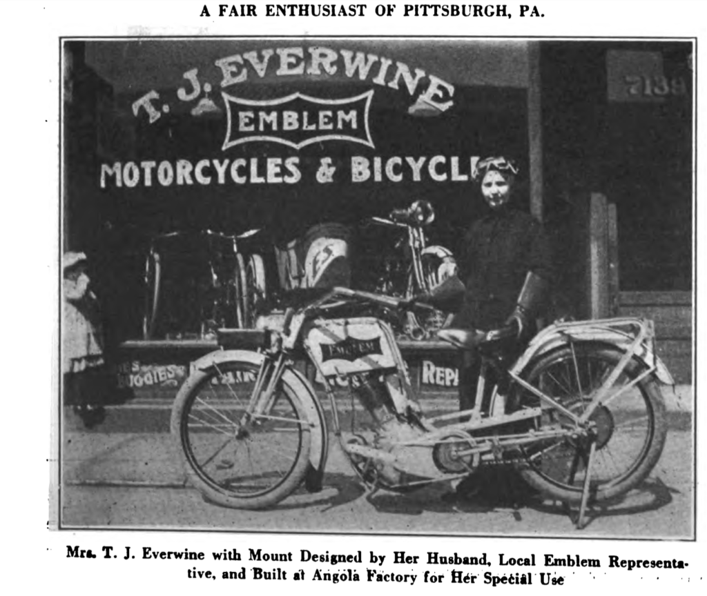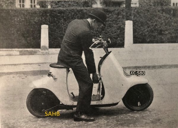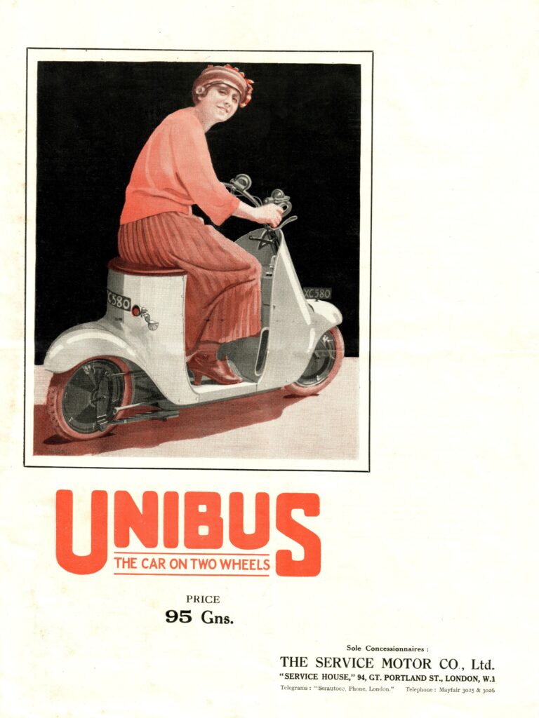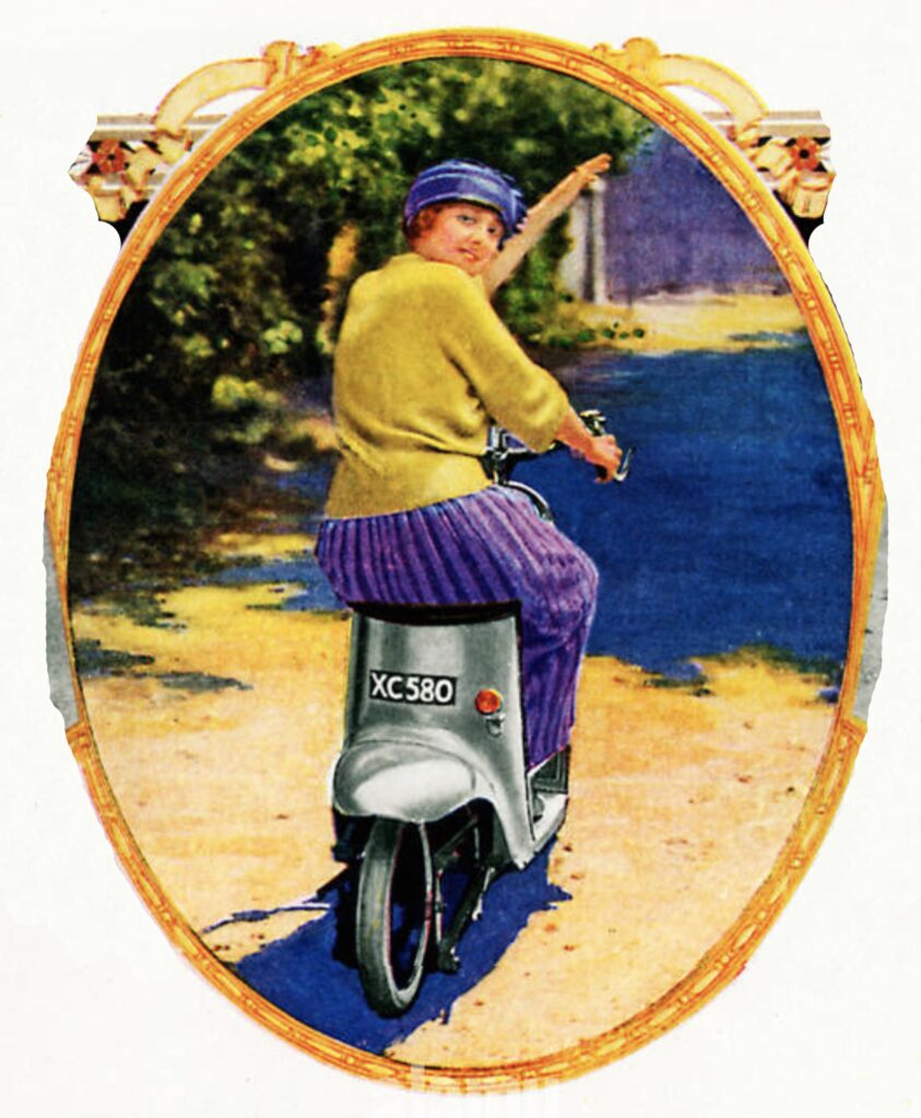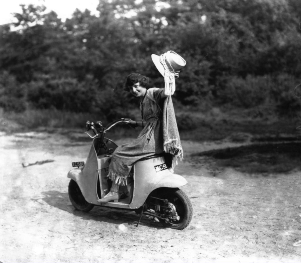 There’s another story to tell around the Unibus and the invention of the scooter: the social history of women on wheels. Two wheelers played an important role in societal changes for women, as the bicycle rolled over Victorian ideas about suitable clothing for women, and their freedom of movement. The Ordinary bicycles’ extraordinary popularity from the 1870s onward had exposed bodices and hoop skirts as simply impossible for a modern lady on the move. In the late 1880s, the smell of freedom wafted around the new Safety bicycle, the original Suffragette conveyance, and in the late 1890s, at the dawn of the motor industry, advertisements featured women riding motorized trikes. By the ‘Noughts and ‘Teens, motorcycles designed especially for women – the Ladies Models – appeared in the catalogues of most British motorcycle manufacturers. The ‘Teens were a heady time for women’s suffrage movement, women were on the verge of gaining the vote in the UK and USA, and the motorcycle industry was eager to exploit what seemed an imminent new market as women took to the wheel.