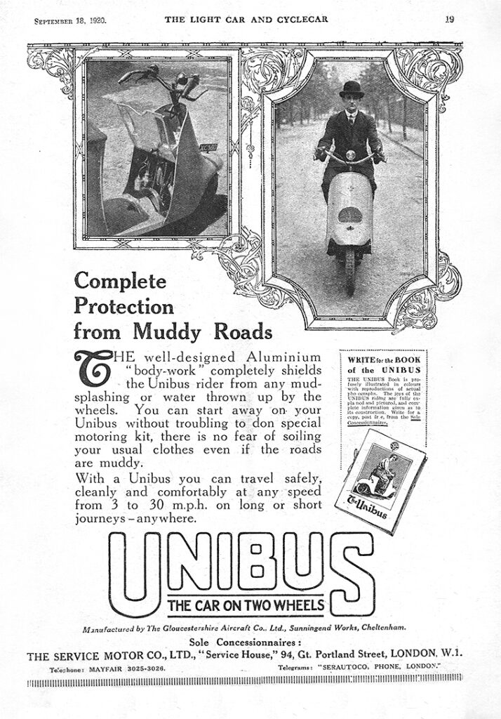 Harold Boultbee’s design for Gloster was unique, and caused a stir when the Unibus was revealed in the Summer of 1920. Dubbed ‘the car on two wheels’, the Unibus was aimed at a genteel clientele, and was priced accordingly at 95 guineas: the same price as the new Brough Superior superbike, and a year’s wages for most working folk. What did one get for such extravagance? Among the most sophisticated two-wheelers on the road, in specification if not in sheer speed (George Brough having comprehensively claimed that space). Technically that meant a simple two-stroke with two-speed gearbox built ‘on automotive principles’, with full springing front and rear plus total bodywork enclosure. The frame was also built on automotive practice, being a sheet steel ‘tub’ with drilled-out horizontal runners and simple cross-panels forming boxes that extended upwards for the steering stem and seat post. The pressed-aluminum bodywork enclosed the whole of the engine, fuel/oil tanks, and mudguard up front, and the flat seat (with copious enclosed cubbys beneath for tools and storage) and rear mudguard combo.