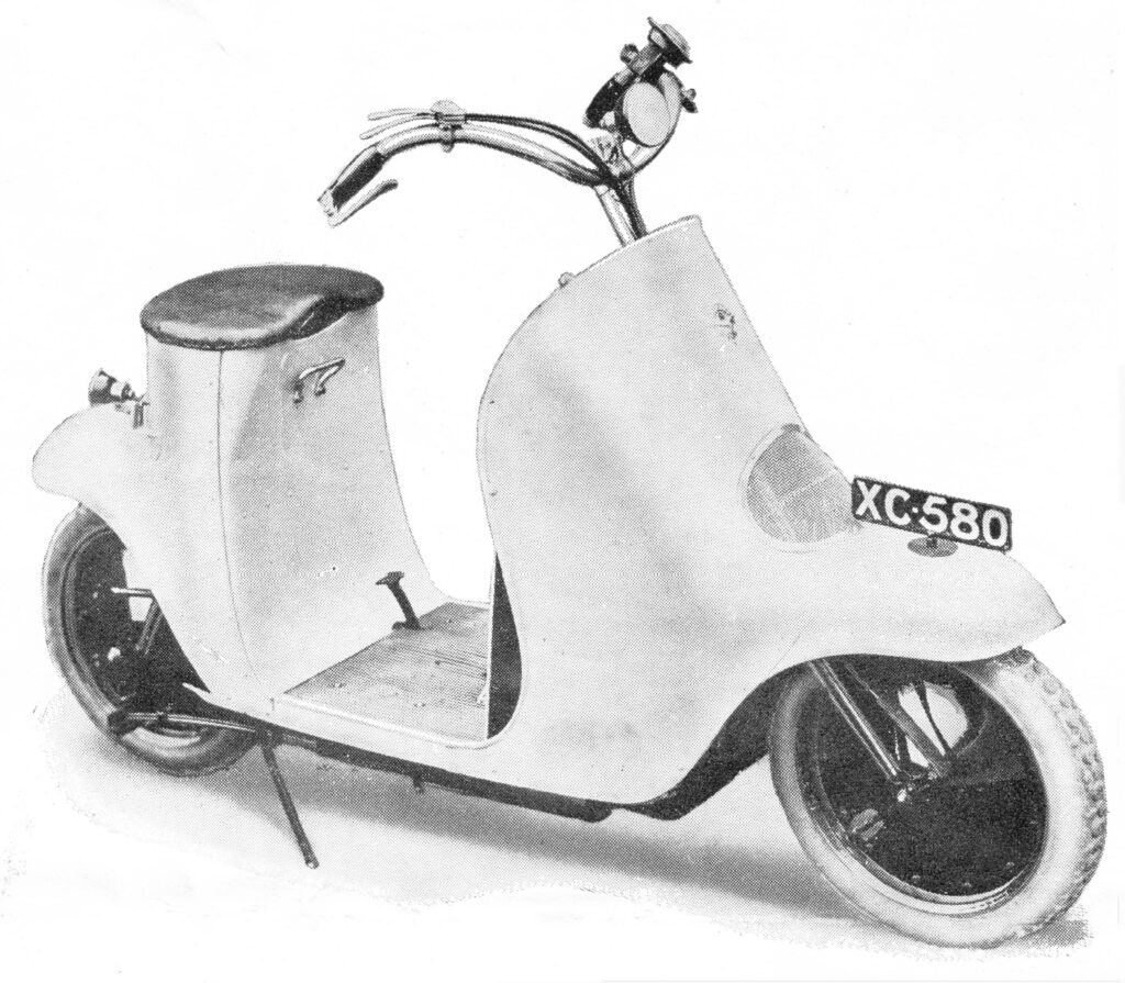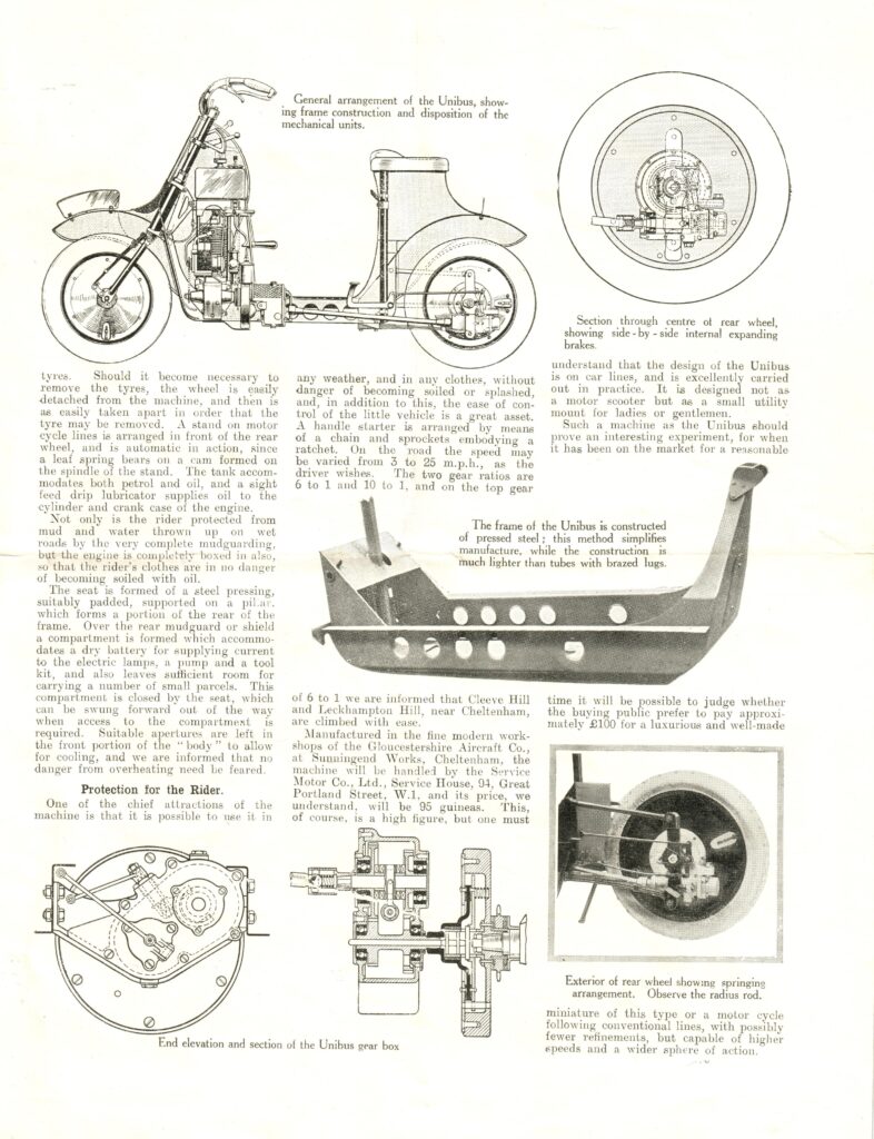 The motive power was a 2½ h.p. (269cc) two-stroke single-cylinder engine set across the frame, which drove through a single dry-plate clutch to a two-speed constant-mesh gearbox set across the frame. The gearbox was connected to a prop-shaft ending at the rear wheel, and used an enclosed worm drive. Perhaps the most unorthodox feature of the Unibus was its dual braking system, with two internal-expanding brakes, one controlled by hand and the other by foot, both acting inside the rear drive housing, rather than the wheel hubs, as later became the norm. Unusually for a motorcycle of the period, the rear wheel was fully sprung, using quarter-elliptic springs attached to a bracket on the worm drive housing, with parallel pivoting arms. The forks were also leaf-sprung, with short fork legs pivoting from the lower steering stem, and the ends of the quarter-eliptics attached to the steering stem and a leading link ahead of the front axle, meaning the fork’s movement was purely fore-and-aft. This was terrible physics, as the wheelbase changed with fork flexure, but in practice (as on the later Neander using the same principles) is surprisingly comfortable and does not spoil handling. Stability was enhanced by using 16” diameter wheels, made of split steel discs (like a Vespa), providing a far more secure ride than a small-wheel machine, and echoing modern practice for more powerful scooters.