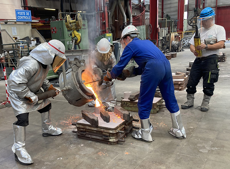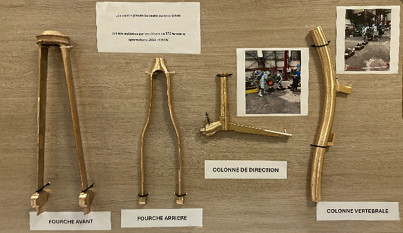 Bronze casting (structural elements, handlebars, and various other parts). The models were 3D printed in PLA resin in the Auvergne region by Philippe Kauffmann. Models with non-standard dimensions required the investment in a specialized 3D printer. Smaller parts were sand-molded and cast in Jean-Pierre Kreder’s workshop, which was equipped with a propane furnace (1100°C) and a crucible. The large and complex frame components of the velocipede were produced in partnership with the Marie Curie vocational high school in Nogent-sur-Oise, which, among other things, offers BTS (Advanced Vocational Training Certificate) programs in foundry work. The constraints of the curriculum meant that the project required two academic years for completion.