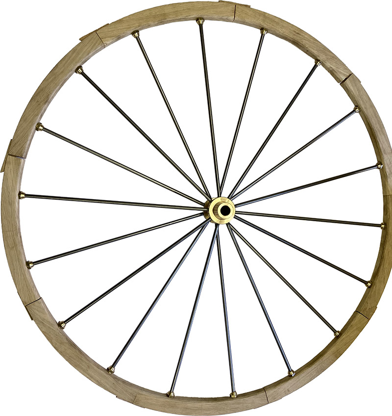 Carpentry (wheel rims, boiler insulation). The wheel rims are made from oak segments assembled and held together by metal spokes and hoops. The boiler insulation consists of a brass sheet and fir slats enclosing a layer of ceramic fabric—admittedly anachronistic, but a significant improvement over the fibrous insulation used in the 19th century.