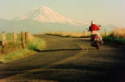 Looked amazingly simple, but of course there was much going on behind the scene. Building the soundtrack, for example, we found that we could not stretch the words out over the full 30 seconds, had to settle for 20-plus to be understandable—which meant the visuals had to not show any bike at first. Then trying to capture the actual motorcycle shot we found that we could not pan fast enough as the bike passed, so we had to make a hidden cut during the pan. And neither the weather nor the motorcycle itself cooperated at first—we had to go out filming on three different days to get the bike actually operating properly, at a time when Mount Rainier was also visible!