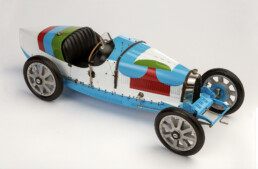 In 1973, Sonia – nearly 90 - was again invited to create a color scheme for a car, in this case a Bugatti T35, supplied to her as a 1:8 scale model by Jean-Paul Fontenelle. The model would be sold at auction to benefit the Bal des petits lits blancs, a children’s hospital charity, and had been organized by Artcurial and Hervé Poulain. The Bugatti T35 was an inspired choice as the perfect 1920s canvas for Sonia’s artwork, and her concept was arguably the best of her three Art Cars, with its colors arranged in bold, colorful roundels against blocks of color in blue, white, red, and green, very much in line with her graphic work over the previous 20 years. The model would have remained just that, a mock-up, had not the imaginative owner of an actual Bugatti T35, Marc Nicolosi, been inspired to make it real. Nicolosi asked his friend Hervé Poulain for permission from Sonia Delaunay to use the color scheme on his car. Her consent is preserved by the Nicolosi family in a letter of 3 October 1977: “I put one condition on this agreement, which is that the production be submitted to me before the words 'after Sonia Delaunay’ are added.” Marc’s son Baptiste Nicolosi continues the tale: “Sadly, my father did not paint the Bugatti in the 1970s, and Sonia died soon after (1979). At the beginning of the 1990s he still wanted to do the paint scheme, so he contacted the owner of the model, asking ‘can you loan me the model so that I copy the paint scheme?’ He said yes, but we could keep the paint scheme ‘only for five years’. We pushed it a little bit, like 6 or seven years, but in the end my father put it back to gray.”